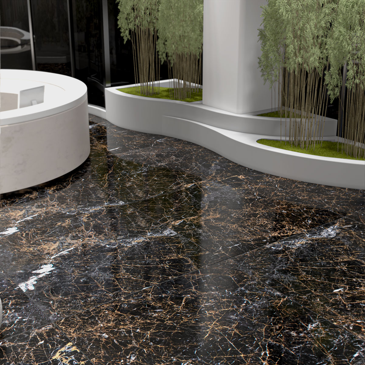 Golden Black Marble with a polished finish, displaying striking black background with elegant golden veining, ideal for luxurious interior designs and applications.